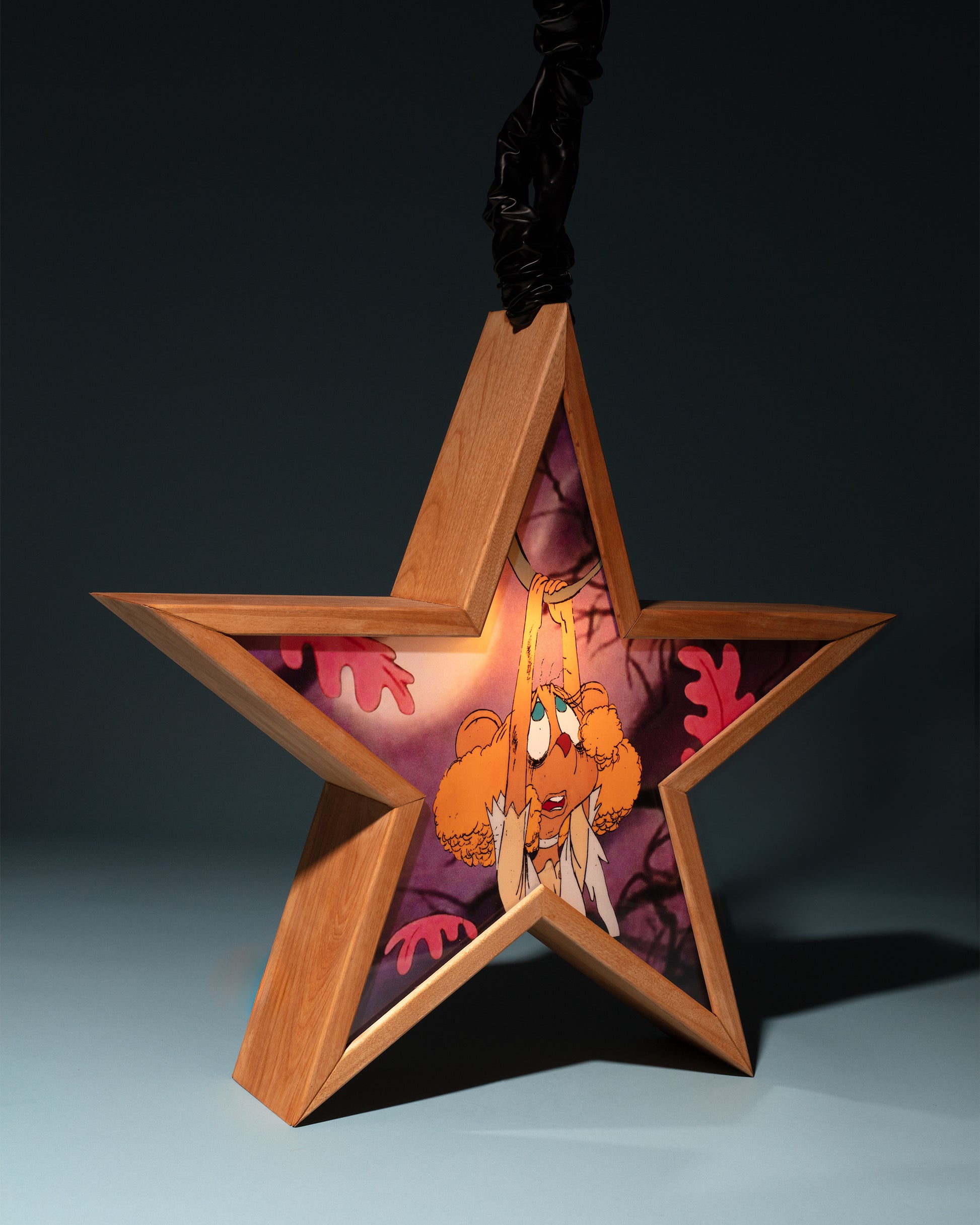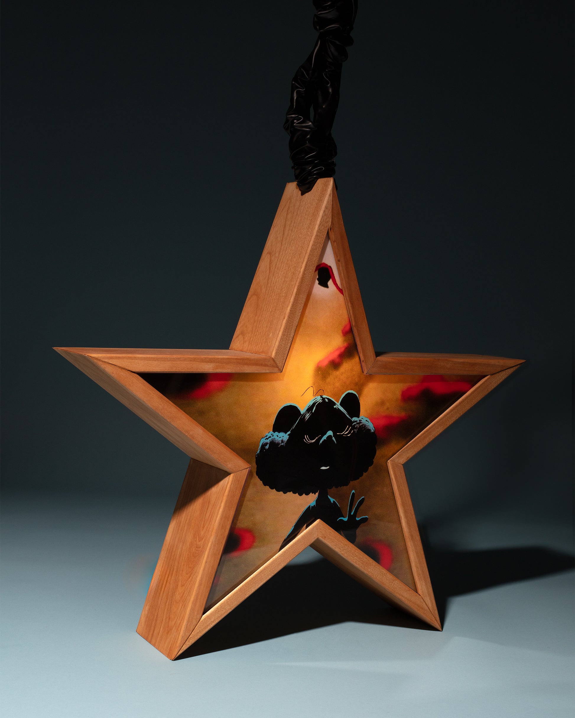 birch, acrylic, backlit film, pleather, light bulb, cord